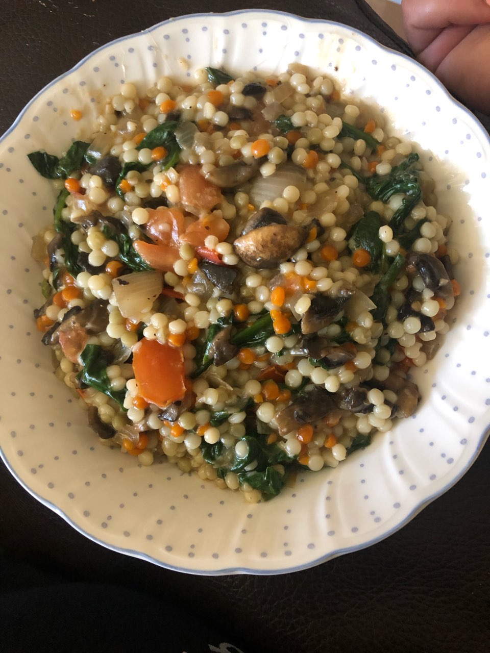 You do not need to be a vegetarian to participate, but please understand and respect that most of us are. The couscous can be served hot or at room temperature. Cook, covered, on high for 1 to 1 1/2 minutes more or until spinach is just wilted and couscous has absorbed liquid. There are loads of options between the base (couscous for this recipe), toppings, and sauce. Healthy & delicious couscous loaded with roasted veggies, fresh mozzarella and herb;
